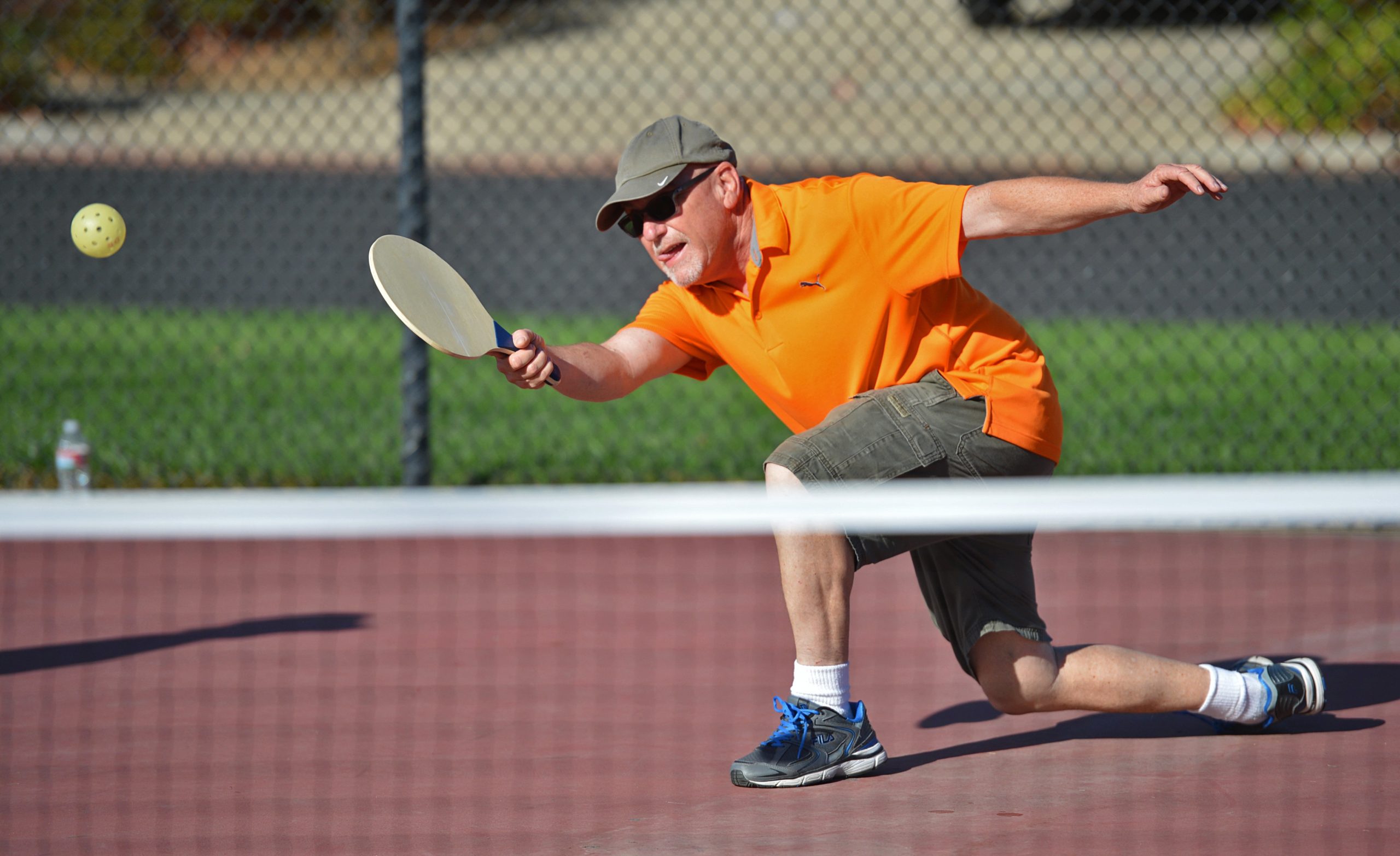 Curtis Stuteville, of Brentwood, returns a ball during a Pickleball game at the Creekside Park Tennis Courts in Brentwood, Calif., on Friday Oct. 16, 2015. Pickleball, a cross between tennis and badminton, is becoming all the rage with the over 50 set. It is less strenuous on the body and easy to learn. David Smookler convinced the City of Brentwood to take a chance on offering a program at the tennis park. (Dan Rosenstrauch/Bay Area News Group)